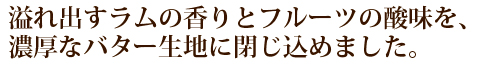 「洋酒のケーキ/レーズン」は、しっとりとした生地と、甘酸っぱいフルーツのコントラストが楽しめるように 1本ずつ丁寧に仕上げました。ラム酒との相性も最適。酸味はやや少なく、濃厚さを感じます。大粒のレーズンがラム酒を多く含むことで、他のケーキよりお酒感を感じます。密封した袋から、シートで巻かれた洋酒のケーキを取り出すとラム酒の香りが広がります。開封後は食感が重たくなってきますが、それも楽しんでください。合わせるお飲み物ですが、開封直後の香りを楽しむときは香りのきつくないストレートの紅茶(ダージリンなど)、重たくなってきたら珈琲と色んな楽しみ方が出来ます。ケーキは常温で送っていますが、外気温の影響で冷えている可能性があります。その場合、箱から取り出し未開封のまま室温に戻してください。保存は、室温(30度以下)。20〜25度ぐらいが良いです。開封後も冷蔵庫保存は固くなります。室温保管で早目にお召し上がりください。開封後は香り、お酒感が徐々に薄れていきますが、ラップ等で密封して頂くと香りの薄れていくスピードが遅くなります。使用酒は、カリブ海マルティニーク島で350年以上の伝統を持つ蒸溜所が生み出すデパズプランテーション。複雑な香りと軽いテイストが世界中から愛されるラム酒の名品です。